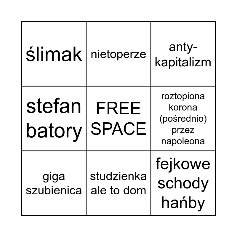 This bingo card has a free space and 14 words: cerkiew, krematorium, giga szubienica, nietoperze, stefan batory, fejkowe schody hańby, gaj urn, ach ci hohenzollerni, studzienka ale to dom, ślimak, ktoś tu chyba nie lubi arki, roztopiona korona (pośrednio) przez napoleona, anty-kapitalizm and lapidarium.