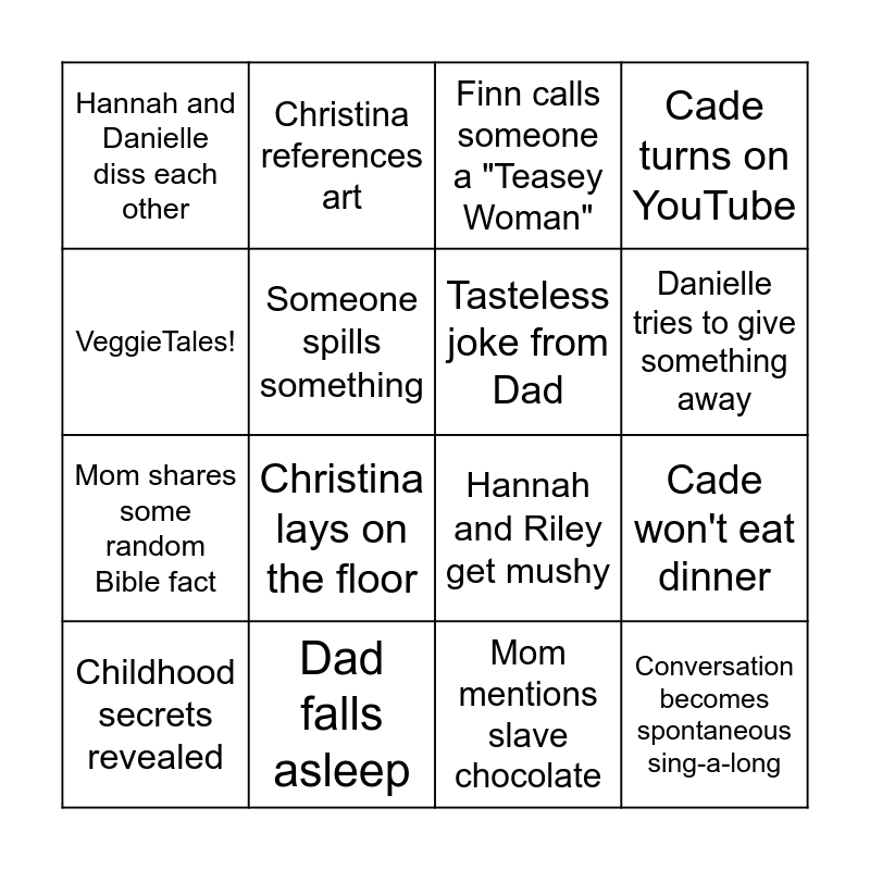 This bingo card has 16 words: Dad falls asleep, Cade won't eat dinner, Finn calls someone a "Teasey Woman", Hannah and Danielle diss each other, Mom shares some random Bible fact, Christina references art, Hannah and Riley get mushy, Mom mentions slave chocolate, VeggieTales!, Someone spills something, Childhood secrets revealed, Cade turns on YouTube, Christina lays on the floor, Danielle tries to give something away, Tasteless joke from Dad and Conversation becomes spontaneous sing-a-long.