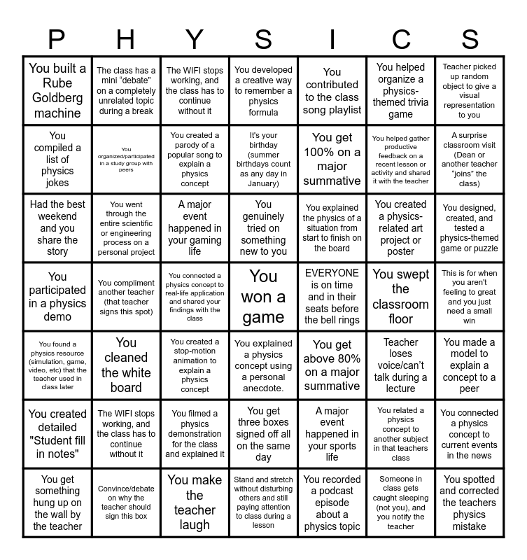 This bingo card has a free space and 59 words: You created a physics meme that was shared to the class, You participated in a physics demo, You helped the teacher set up a lab/project, You went through the entire scientific or engineering process on a personal project, You connected a physics concept to real-life application and shared your findings with the class, You related a physics concept to another subject in that teachers class, Teacher picked up random object to give a visual representation to you, You found a physics error in a popular movie or TV show, and can explain why it's wrong, You organized/participated in a study group with peers, You connected a physics concept to current events in the news, You developed a creative way to remember a physics formula, You filmed a physics demonstration for the class and explained it, You helped organize a physics-themed trivia game, You created a stop-motion animation to explain a physics concept, You recorded a podcast episode about a physics topic, You built a Rube Goldberg machine, You helped gather productive feedback on a recent lesson or activity and shared it with the teacher, You contributed to the class song playlist, You created a flowchart on how to solve a problem step by step, You compiled a list of physics jokes, A surprise classroom visit (Dean or another teacher “joins” the class), The WIFI stops working, and the class has to continue without it, You designed, created, and tested a physics-themed game or puzzle, You created a physics-related art project or poster, You created a comic strip or storyboard illustrating a physics concept, You explained a physics concept using a personal anecdote., You found a physics resource (simulation, game, video, etc) that the teacher used in class later, You created a flashcard set for physics, You created a parody of a popular song to explain a physics concept, Teacher loses voice/can’t talk during a lecture, You researched a famous physicist and presented their impact in the modern world, The WIFI stops working, and the class has to continue without it, Stand and stretch without disturbing others and still paying attention to class during a lesson, Someone in class gets caught sleeping (not you), and you notify the teacher, The class has a mini “debate” on a completely unrelated topic during a break, EVERYONE is on time and in their seats before the bell rings, You get three boxes signed off all on the same day, You get 100% on a major summative, You get above 80% on a major summative, It's your birthday (summer birthdays count as any day in January), A major event happened in your sports life, A major event happened in your gaming life, Had the best weekend and you share the story, You beat teacher in “rock paper scissors” (only one student gets to challenge per day), This is for when you aren't feeling to great and you just need a small win, You get something hung up on the wall by the teacher, Convince/debate on why the teacher should sign this box, You make the teacher laugh, You genuinely tried on something new to you, You compliment another teacher (that teacher signs this spot), You draw a better visual model on the board better than the teacher, You created detailed "Student fill in notes", You swept the classroom floor, You cleaned the white board, You made a model to explain a concept to a peer, You explained the physics of a situation from start to finish on the board, You helped peer tutor another student outside of class, You spotted and corrected the teachers physics mistake and You asked a thoughtful question during lecture.