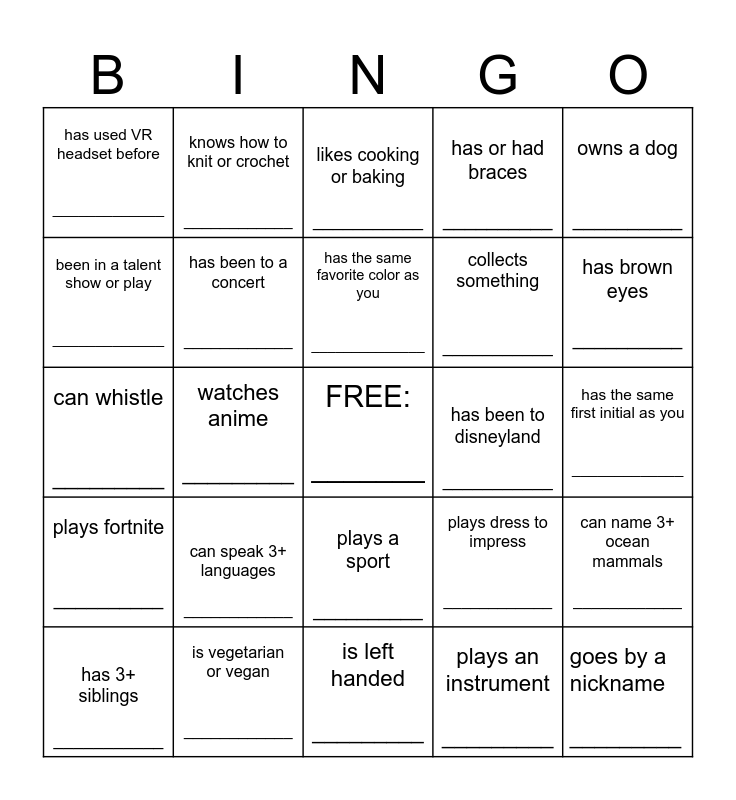 This bingo card has a free space and 44 words: has a birthday this month __________, goes by a nickname _________, is wearing glasses _________, has 3+ siblings ___________, is the youngest child ___________, plays an instrument _________, likes cooking or baking ___________, owns a cat _________, owns a dog __________, is vegetarian or vegan ____________, has or had braces __________, has been to disneyland ___________, plays a sport __________, can speak 3+ languages ____________, has lived in more than one state ___________, is left handed _________, is wearing earrings _________, can whistle _________, favorite pizza is pepperoni ____________, has brown eyes __________, knows how to knit or crochet ____________, takes BART or bus to school ___________, has painted toenails ___________, has used VR headset before _____________, likes to fish _________, has the same first initial as you _____________, has a younger sibling ____________, loves to draw or paint ______________, plays dress to impress ____________, plays fortnite __________, can name 3+ types of fish _____________, can name 3+ ocean mammals ____________, likes spicy food __________, likes pineapple on pizza ___________, watches anime _________, likes to read for fun __________, has more than 1 middle name ______________, was born in a different city ____________, has the same favorite color as you ______________, been in a talent show or play _____________, collects something ___________, can recite part of a poem/song/rap _____________, has been to a concert ____________ and has broken a bone ____________.