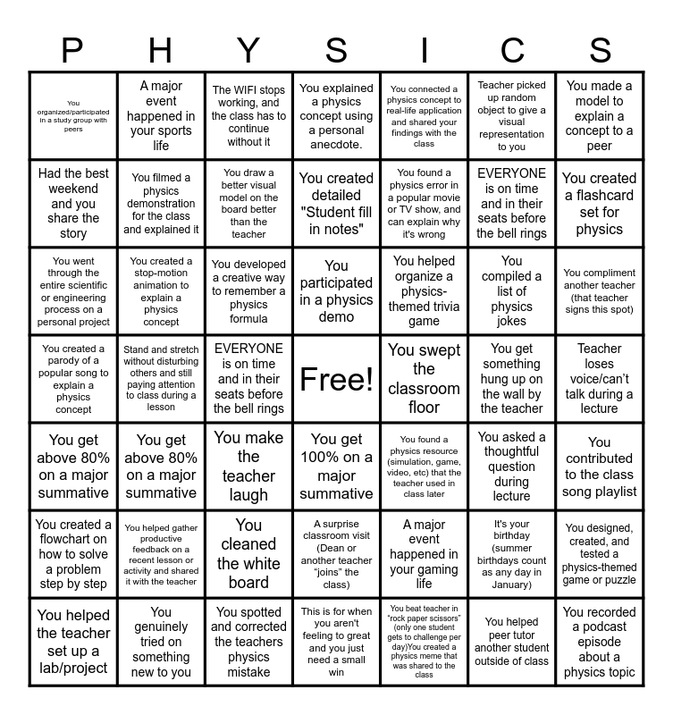 This bingo card has a free space and 68 words: The class has a mini “debate” on a completely unrelated topic during a break, EVERYONE is on time and in their seats before the bell rings, You get three boxes signed off all on the same day, You get 100% on a major summative, You get above 80% on a major summative, It's your birthday (summer birthdays count as any day in January), A major event happened in your sports life, A major event happened in your gaming life, Had the best weekend and you share the story, You beat teacher in “rock paper scissors” (only one student gets to challenge per day)You created a physics meme that was shared to the class, You participated in a physics demo, You helped the teacher set up a lab/project, You went through the entire scientific or engineering process on a personal project, You connected a physics concept to real-life application and shared your findings with the class, You related a physics concept to another subject in that teachers class, Teacher picked up random object to give a visual representation to you, You found a physics error in a popular movie or TV show, and can explain why it's wrong, You organized/participated in a study group with peers, You connected a physics concept to current events in the news, You developed a creative way to remember a physics formula, You filmed a physics demonstration for the class and explained it, You helped organize a physics-themed trivia game, You created a stop-motion animation to explain a physics concept, You recorded a podcast episode about a physics topic, You built a Rube Goldberg machine, You helped gather productive feedback on a recent lesson or activity and shared it with the teacher, You contributed to the class song playlist, You created a flowchart on how to solve a problem step by step, You compiled a list of physics jokes, A surprise classroom visit (Dean or another teacher “joins” the class), The WIFI stops working, and the class has to continue without it, You designed, created, and tested a physics-themed game or puzzle, You created a physics-related art project or poster, You created a comic strip or storyboard illustrating a physics concept, You explained a physics concept using a personal anecdote., You make the teacher laugh, You genuinely tried on something new to you, You compliment another teacher (that teacher signs this spot), You draw a better visual model on the board better than the teacher, You created detailed "Student fill in notes", You swept the classroom floor, You cleaned the white board, You made a model to explain a concept to a peer, You explained the physics of a situation from start to finish on the board, You helped peer tutor another student outside of class, You spotted and corrected the teachers physics mistake, You asked a thoughtful question during lecture, You found a physics resource (simulation, game, video, etc) that the teacher used in class later, You created a flashcard set for physics, You created a parody of a popular song to explain a physics concept, Teacher loses voice/can’t talk during a lecture, You researched a famous physicist and presented their impact in the modern world, The WIFI stops working, and the class has to continue without it, Stand and stretch without disturbing others and still paying attention to class during a lesson, Someone in class gets caught sleeping (not you), and you notify the teacher, The class has a mini “debate” on a completely unrelated topic during a break, EVERYONE is on time and in their seats before the bell rings, You get three boxes signed off all on the same day, You get 100% on a major summative, You get above 80% on a major summative, It's your birthday (summer birthdays count as any day in January), A major event happened in your sports life, A major event happened in your gaming life, Had the best weekend and you share the story, You beat teacher in “rock paper scissors” (only one student gets to challenge per day), This is for when you aren't feeling to great and you just need a small win, You get something hung up on the wall by the teacher and Convince/debate on why the teacher should sign this box.