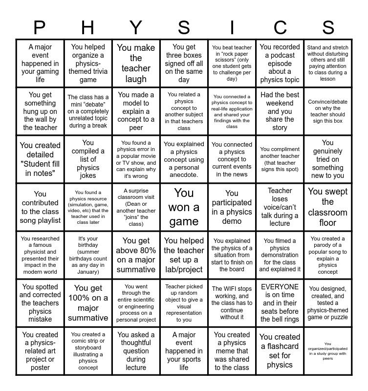 This bingo card has a free space and 58 words: You helped gather productive feedback on a recent lesson or activity and shared it with the teacher, You contributed to the class song playlist, You created a flowchart on how to solve a problem step by step, You compiled a list of physics jokes, A surprise classroom visit (Dean or another teacher “joins” the class), The WIFI stops working, and the class has to continue without it, Stand and stretch without disturbing others and still paying attention to class during a lesson, Someone in class gets caught sleeping (not you), and you notify the teacher, The class has a mini “debate” on a completely unrelated topic during a break, EVERYONE is on time and in their seats before the bell rings, You get three boxes signed off all on the same day, You get 100% on a major summative, You get above 80% on a major summative, It's your birthday (summer birthdays count as any day in January), A major event happened in your sports life, A major event happened in your gaming life, Had the best weekend and you share the story, You beat teacher in “rock paper scissors” (only one student gets to challenge per day), This is for when you aren't feeling to great and you just need a small win, You get something hung up on the wall by the teacher, Convince/debate on why the teacher should sign this box, You make the teacher laugh, You genuinely tried on something new to you, You compliment another teacher (that teacher signs this spot), You draw a better visual model on the board better than the teacher, You created detailed "Student fill in notes", You swept the classroom floor, You cleaned the white board, You made a model to explain a concept to a peer, You explained the physics of a situation from start to finish on the board, You helped peer tutor another student outside of class, You spotted and corrected the teachers physics mistake, You asked a thoughtful question during lecture, You created a physics meme that was shared to the class, You participated in a physics demo, You helped the teacher set up a lab/project, You went through the entire scientific or engineering process on a personal project, You connected a physics concept to real-life application and shared your findings with the class, You related a physics concept to another subject in that teachers class, Teacher picked up random object to give a visual representation to you, You found a physics error in a popular movie or TV show, and can explain why it's wrong, You organized/participated in a study group with peers, You connected a physics concept to current events in the news, You developed a creative way to remember a physics formula, You designed, created, and tested a physics-themed game or puzzle, You created a physics-related art project or poster, You created a comic strip or storyboard illustrating a physics concept, You explained a physics concept using a personal anecdote., You found a physics resource (simulation, game, video, etc) that the teacher used in class later, You created a flashcard set for physics, You created a parody of a popular song to explain a physics concept, Teacher loses voice/can’t talk during a lecture, You researched a famous physicist and presented their impact in the modern world, You filmed a physics demonstration for the class and explained it, You helped organize a physics-themed trivia game, You created a stop-motion animation to explain a physics concept, You recorded a podcast episode about a physics topic and You built a Rube Goldberg machine.