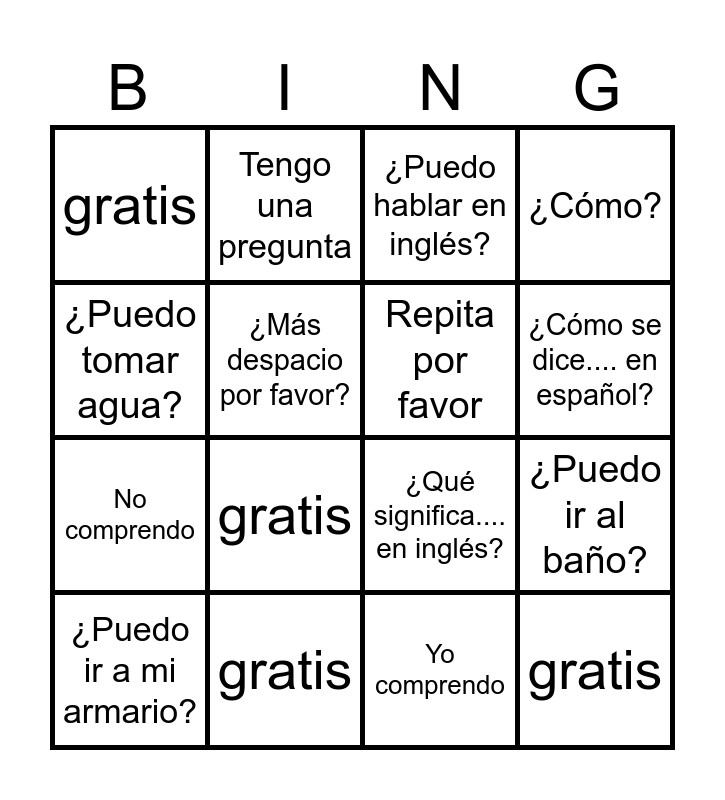This bingo card has 16 words: gratis, ¿Puedo ir al baño?, ¿Puedo hablar en inglés?, gratis, No comprendo, Tengo una pregunta, ¿Qué significa.... en inglés?, Yo comprendo, ¿Puedo tomar agua?, ¿Más despacio por favor?, ¿Puedo ir a mi armario?, ¿Cómo?, gratis, ¿Cómo se dice.... en español?, Repita por favor and gratis.