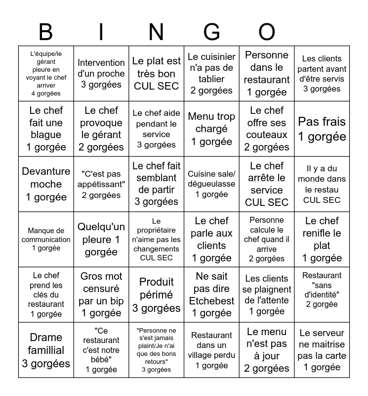 This bingo card has 36 words: Ne sait pas dire Etchebest 1 gorgée, Produit périmé 3 gorgées, Restaurant dans un village perdu 1 gorgée, Le chef fait une blague 1 gorgée, Manque de communication 1 gorgée, Cuisine sale/ dégueulasse 1 gorgée, Le chef provoque le gérant 2 gorgées, "Personne ne s'est jamais plaint/Je n'ai que des bons retours" 3 gorgées, Personne dans le restaurant 1 gorgée, Les clients se plaignent de l'attente 1 gorgée, Pas frais 1 gorgée, Le cuisinier n'a pas de tablier 2 gorgées, Restaurant "sans d'identité" 2 gorgée, "C'est pas appétissant" 2 gorgées, Menu trop chargé 1 gorgée, L'équipe/le gérant pleure en voyant le chef arriver 4 gorgées, Le chef prend les clés du restaurant 1 gorgée, Le chef arrête le service CUL SEC, Devanture moche 1 gorgée, Le plat est très bon CUL SEC, Le chef fait semblant de partir 3 gorgées, Quelqu'un pleure 1 gorgée, Le chef parle aux clients 1 gorgée, Le propriétaire n'aime pas les changements CUL SEC, Personne calcule le chef quand il arrive 2 gorgées, Intervention d'un proche 3 gorgées, Le chef offre ses couteaux 2 gorgées, "Ce restaurant c'est notre bébé" 1 gorgée, Le chef aide pendant le service 3 gorgées, Les clients partent avant d'être servis 3 gorgées, Le serveur ne maitrise pas la carte 1 gorgée, Drame famillial 3 gorgées, Le chef renifle le plat 1 gorgée, Il y a du monde dans le restau CUL SEC, Gros mot censuré par un bip 1 gorgée and Le menu n'est pas à jour 2 gorgées.