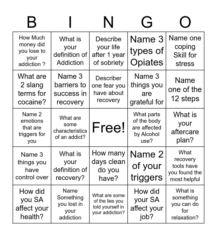 This bingo card has a free space and 24 words: What is your definition of recovery?, Name Something you lost in your addiction, Describer one fear you have about recovery, How did you SA affect your health?, Name one coping Skill for stress, How Much money did you lose to your addiction ?, What are 2 slang terms for cocaine?, What is your definition of Addiction, What parts of the body are affected by Alcohol use?, How many days clean do you have?, Name 3 things you are grateful for, Name 2 emotions that are triggers for you, Name 2 of your triggers, What recovery tools have you found the most helpful, Name 3 barriers to success in recovery, How did your SA affect your job?, What is your aftercare plan?, Describe your life after 1 year of sobriety, Name one of the 12 steps, What are some characteristics of an addict?, What is something you can do for relaxation?, Name 3 things you have control over, Name 3 types of Opiates and What are some of the lies you told yourself in your addiction?.
