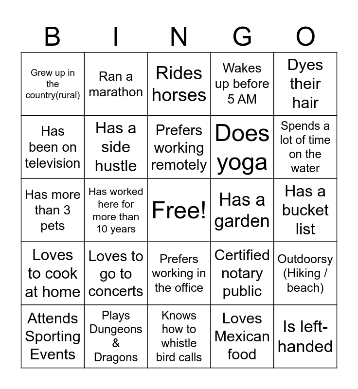 This bingo card has a free space and 24 words: Loves to go to concerts, Plays Dungeons & Dragons, Prefers working remotely, Attends Sporting Events, Dyes their hair, Grew up in the country(rural), Has been on television, Ran a marathon, Has a garden, Prefers working in the office, Does yoga, Has more than 3 pets, Certified notary public, Outdoorsy (Hiking / beach), Has a side hustle, Loves Mexican food, Has a bucket list, Rides horses, Spends a lot of time on the water, Has worked here for more than 10 years, Is left-handed, Loves to cook at home, Wakes up before 5 AM and Knows how to whistle bird calls.
