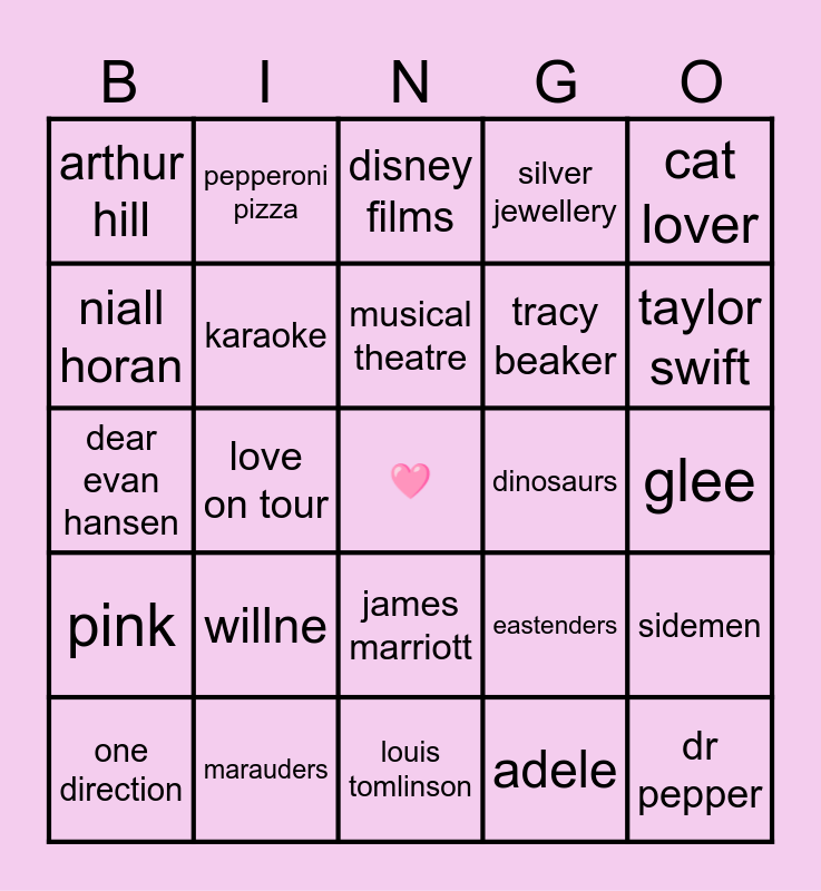 This bingo card has a free space and 24 words: willne, marauders, musical theatre, one direction, cat lover, arthur hill, niall horan, pepperoni pizza, dinosaurs, james marriott, tracy beaker, dear evan hansen, eastenders, sidemen, karaoke, adele, glee, disney films, taylor swift, love on tour, dr pepper, pink, silver jewellery and louis tomlinson.