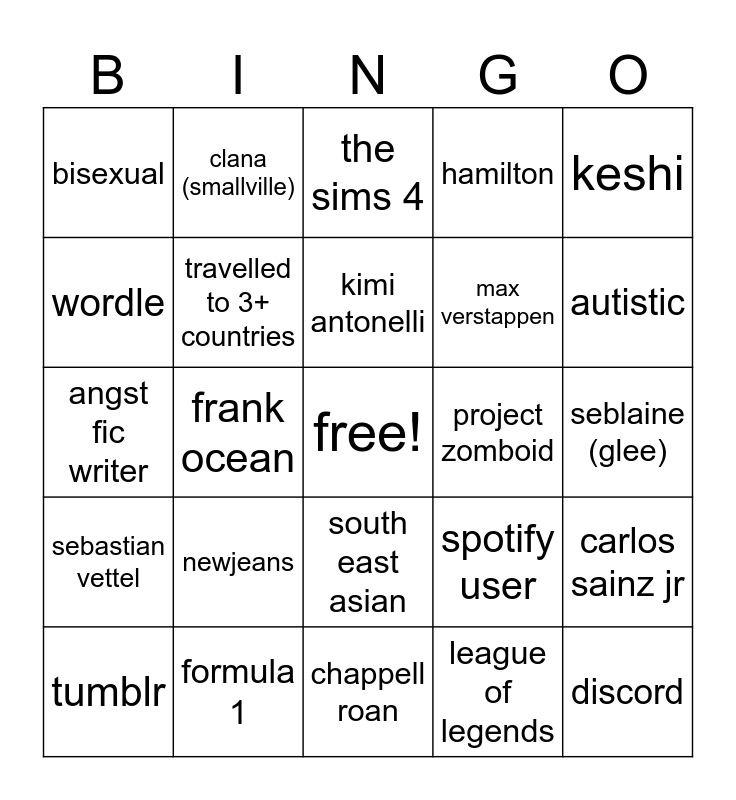 This bingo card has a free space and 24 words: newjeans, formula 1, kimi antonelli, tumblr, keshi, bisexual, wordle, clana (smallville), project zomboid, south east asian, max verstappen, angst fic writer, spotify user, carlos sainz jr, travelled to 3+ countries, league of legends, seblaine (glee), the sims 4, autistic, frank ocean, discord, sebastian vettel, hamilton and chappell roan.