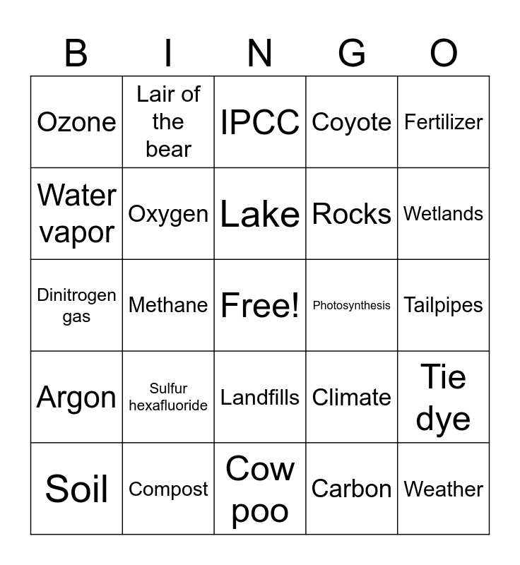 This bingo card has a free space and 29 words: Soil, Carbon dioxide, Methane, Cow burps, Ozone, IPCC, Oxygen, Sulfur hexafluoride, Photosynthesis, Compost, Tailpipes, Weather, Cow poo, Carbon, Wetlands, Energy generation, Landfills, Argon, Fertilizer, Dinitrogen gas, Climate, Nitrous oxide, Rocks, Water vapor, Coyote, Lair of the bear, Tie dye, Lake and Ice cream.