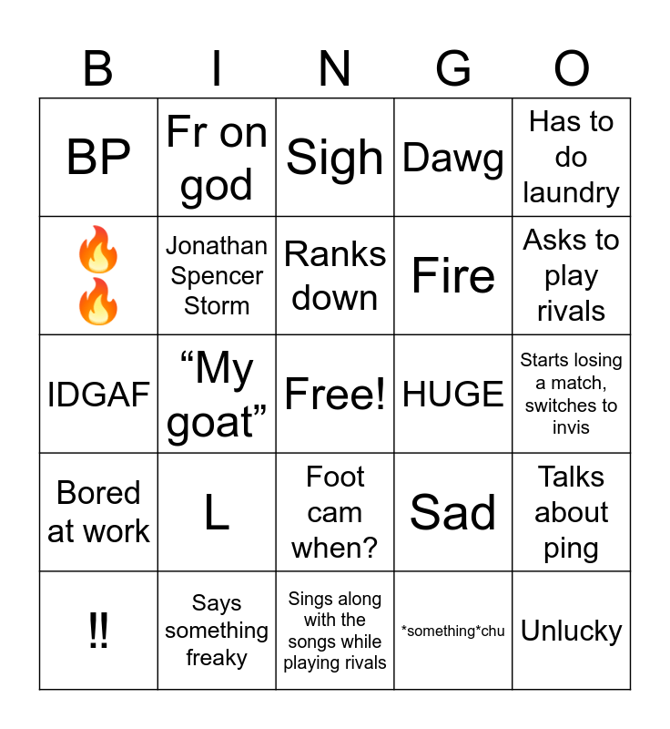 This bingo card has a free space and 24 words: L, Says something freaky, Ranks down, ‼️, Has to do laundry, BP, 🔥🔥, Fr on god, HUGE, Foot cam when?, Fire, IDGAF, Sad, Talks about ping, Jonathan Spencer Storm, *something*chu, Starts losing a match, switches to invis, Sigh, Asks to play rivals, “My goat”, Unlucky, Bored at work, Dawg and Sings along with the songs while playing rivals.