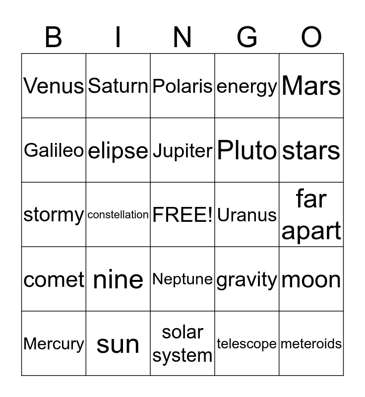 This bingo card has a free space and 24 words: nine, sun, Jupiter, Mercury, Mars, Venus, Galileo, Saturn, Uranus, Neptune, Pluto, stormy, gravity, moon, elipse, telescope, far apart, Polaris, stars, constellation, meteroids, comet, energy and solar system.