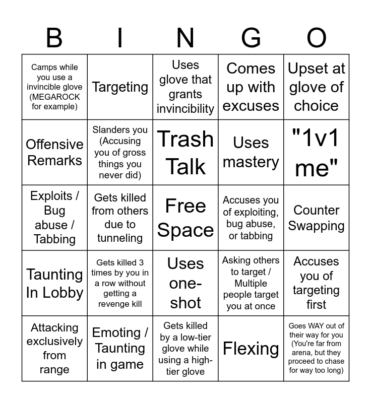 This bingo card has a free space and 24 words: Gets killed 3 times by you in a row without getting a revenge kill, Emoting / Taunting in game, Trash Talk, Attacking exclusively from range, Upset at glove of choice, Camps while you use a invincible glove (MEGAROCK for example), Offensive Remarks, Targeting, Accuses you of exploiting, bug abuse, or tabbing, Uses one-shot, Uses mastery, Exploits / Bug abuse / Tabbing, Asking others to target / Multiple people target you at once, Accuses you of targeting first, Slanders you (Accusing you of gross things you never did), Flexing, Counter Swapping, Uses glove that grants invincibility, "1v1 me", Gets killed from others due to tunneling, Goes WAY out of their way for you (You're far from arena, but they proceed to chase for way too long), Taunting In Lobby, Comes up with excuses and Gets killed by a low-tier glove while using a high-tier glove.