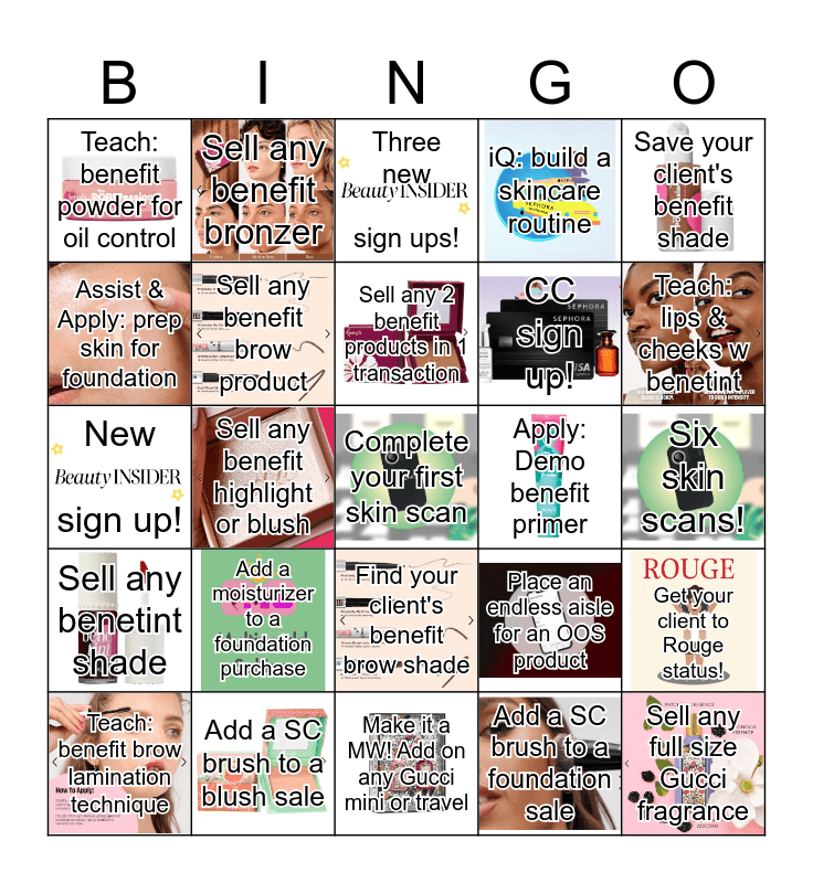 This bingo card has 24 images, a free space and 24 words: Add a moisturizer to a foundation purchase, Add a SC brush to a blush sale, Sell any 2 benefit products in 1 transaction, Teach: benefit brow lamination technique, Save your client's benefit shade, Teach: benefit powder for oil control, Assist & Apply: prep skin for foundation, Sell any benefit bronzer, Apply: Demo benefit primer, Find your client's benefit brow shade, CC sign up!, New sign up!, Place an endless aisle for an OOS product, Get your client to Rouge status!, Sell any benefit brow product, Add a SC brush to a foundation sale, Six skin scans!, Three new sign ups!, Teach: lips & cheeks w benetint, Sell any benefit highlight or blush, Sell any full size Gucci fragrance, Sell any benetint shade, iQ: build a skincare routine and Make it a MW! Add on any Gucci mini or travel.