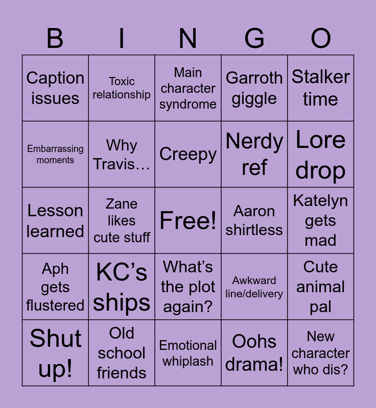 This bingo card has a free space and 24 words: Shut up!, KC’s ships, Creepy, Oohs drama!, Stalker time, Caption issues, Toxic relationship, Main character syndrome, Aaron shirtless, Katelyn gets mad, Lesson learned, Why Travis…, Awkward line/delivery, Cute animal pal, Embarrassing moments, Old school friends, Emotional whiplash, Garroth giggle, Lore drop, Aph gets flustered, Zane likes cute stuff, What’s the plot again?, Nerdy ref and New character who dis?.