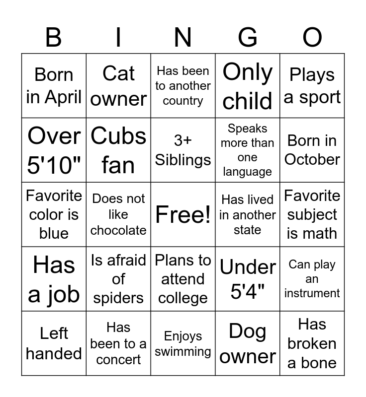This bingo card has a free space and 27 words: Sox fan, Has been to a concert, 3+ Siblings, Dog owner, Plays a sport, Over 5'10", Cat owner, Enjoys swimming, Has lived in another state, Can play an instrument, Has a job, Cubs fan, Under 5'4", Has broken a bone, Favorite color is blue, Has brown eyes, Has been to another country, Only child, Favorite subject is math, Born in April, Is afraid of spiders, Plans to attend college, Speaks more than one language, Born in October, Left handed, Does not like chocolate and Walks or bikes to school.