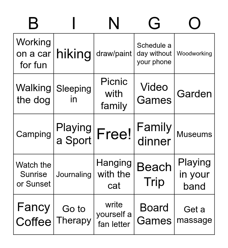 This bingo card has a free space and 24 words: Journaling, Go to Therapy, Picnic with family, Fancy Coffee, Woodworking, Working on a car for fun, Walking the dog, hiking, Family dinner, Hanging with the cat, Video Games, Camping, Beach Trip, Playing in your band, Sleeping in, Board Games, Museums, draw/paint, Garden, Playing a Sport, Get a massage, Watch the Sunrise or Sunset, Schedule a day without your phone and write yourself a fan letter.