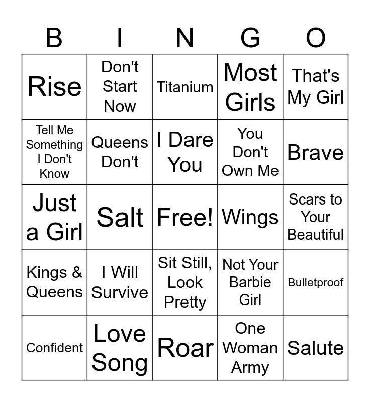 This bingo card has a free space and 39 words: Take A Hint, Fight Song, Part Of Me, Queens Don't, Confident, Sit Still, Look Pretty, I Dare You, Learn To Let Go, That's My Girl, Kings & Queens, Salt, Most Girls, Salute, Scars to Your Beautiful, Wings, I Will Survive, Who Says, Rise, Power, Not Your Barbie Girl, Tell Me Something I Don't Know, Roar, You Don't Own Me, Brave, Fighter, Stronger (What Doesn't Kill You), Since U Been Gone, Shout Out To My Ex, Just Like Fire, Don't Start Now, Don't Call Me Up, Girl on Fire, Titanium, Love Song, One Woman Army, The Greatest, Bulletproof, Just a Girl and Cinderella.