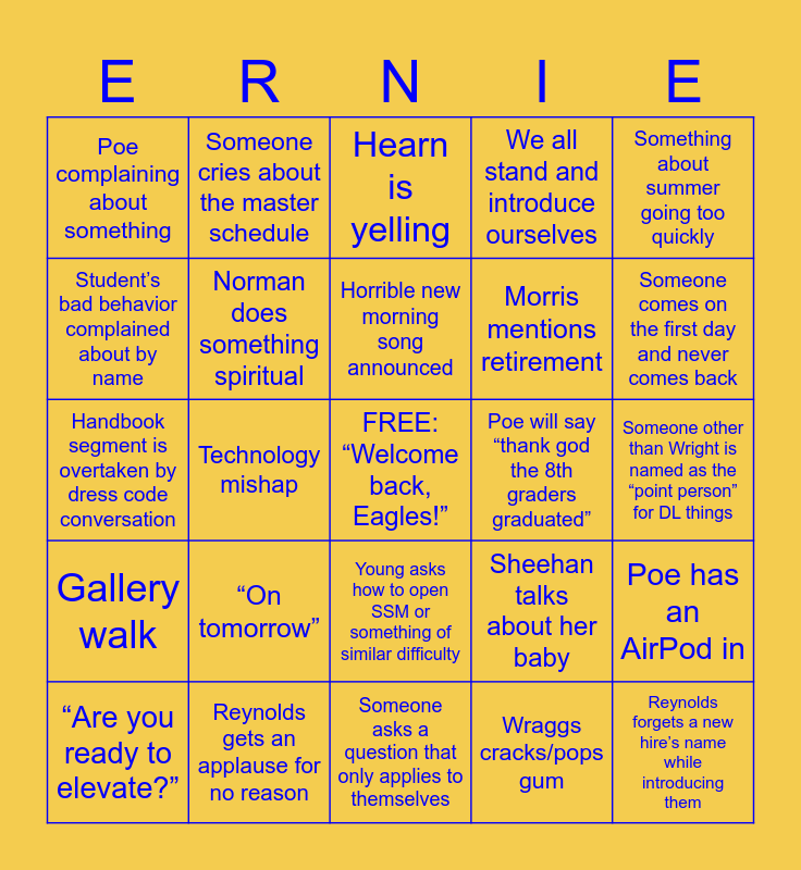 This bingo card has a free space and 24 words: “On tomorrow”, Reynolds gets an applause for no reason, Horrible new morning song announced, “Are you ready to elevate?”, Something about summer going too quickly, Poe complaining about something, Student’s bad behavior complained about by name, Someone cries about the master schedule, Poe will say “thank god the 8th graders graduated”, Young asks how to open SSM or something of similar difficulty, Morris mentions retirement, Handbook segment is overtaken by dress code conversation, Sheehan talks about her baby, Poe has an AirPod in, Norman does something spiritual, Wraggs cracks/pops gum, Someone other than Wright is named as the “point person” for DL things, Hearn is yelling, Someone comes on the first day and never comes back, Technology mishap, Reynolds forgets a new hire’s name while introducing them, Gallery walk, We all stand and introduce ourselves and Someone asks a question that only applies to themselves.