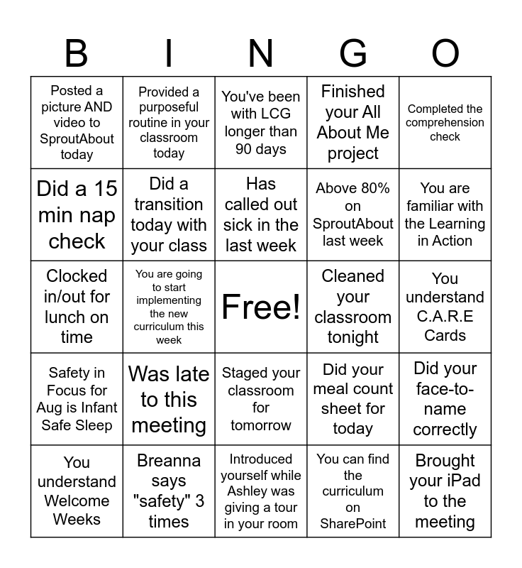This bingo card has a free space and 24 words: Was late to this meeting, Breanna says "safety" 3 times, Has called out sick in the last week, You understand Welcome Weeks, Completed the comprehension check, Posted a picture AND video to SproutAbout today, Did a 15 min nap check, Provided a purposeful routine in your classroom today, Cleaned your classroom tonight, Staged your classroom for tomorrow, Above 80% on SproutAbout last week, Clocked in/out for lunch on time, Did your meal count sheet for today, Did your face-to-name correctly, Did a transition today with your class, You can find the curriculum on SharePoint, You understand C.A.R.E Cards, You've been with LCG longer than 90 days, You are familiar with the Learning in Action, You are going to start implementing the new curriculum this week, Brought your iPad to the meeting, Safety in Focus for Aug is Infant Safe Sleep, Finished your All About Me project and Introduced yourself while Ashley was giving a tour in your room.