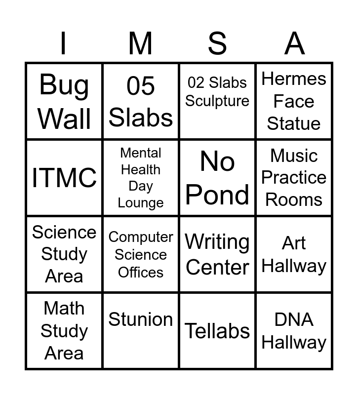 This bingo card has 16 words: Stunion, Art Hallway, 02 Slabs Sculpture, Bug Wall, Science Study Area, 05 Slabs, Writing Center, Tellabs, ITMC, Mental Health Day Lounge, Math Study Area, Hermes Face Statue, Computer Science Offices, Music Practice Rooms, No Pond and DNA Hallway.