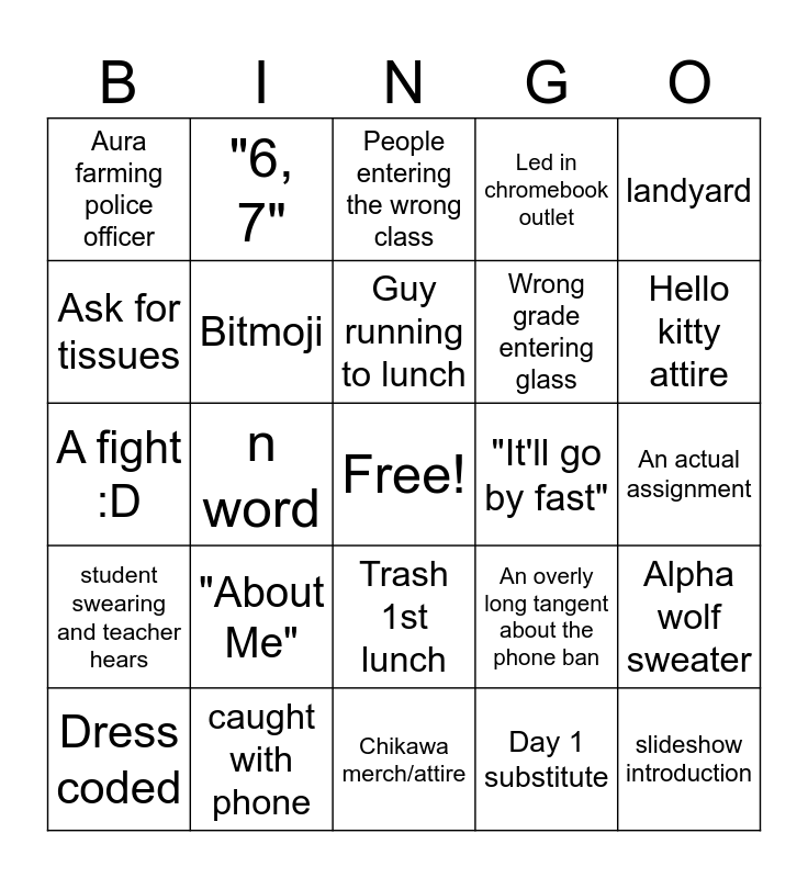 This bingo card has a free space and 24 words: "About Me", caught with phone, Guy running to lunch, Dress coded, landyard, Aura farming police officer, Ask for tissues, "6, 7", "It'll go by fast", Trash 1st lunch, Wrong grade entering glass, A fight :D, An overly long tangent about the phone ban, Alpha wolf sweater, Bitmoji, Day 1 substitute, An actual assignment, People entering the wrong class, Hello kitty attire, n word, slideshow introduction, student swearing and teacher hears, Led in chromebook outlet and Chikawa merch/attire.