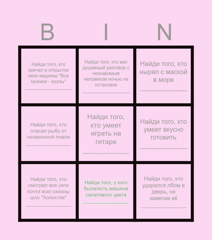 This bingo card has 9 words: Найди того, кто смотрел все (или почти все) сезоны шоу "Холостяк" ________________, Найди того, кто нырял с маской в море _____________, Найди того, кто вел душевный разговор с незнакомым человеком ночью на остановке __________________, Найди того, кто спасал рыбу от незаконной ловли ________________, Найди того, кто кричал в открытое окно машины "Все мужики - козлы" __________________, Найди того, кто умеет вкусно готовить _____________, Найди того, кто умеет играть на гитаре ____________, Найди того, кто ударялся лбом в дверь, не заметив её _______________ and Найди того, у кого была/есть машина салатового цвета ________________.