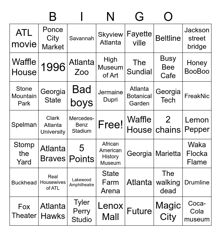 This bingo card has a free space and 75 words: Hartsfield-Jackson Atlanta International Airport, Buckhead, Savannah, Atlanta, Cascade, Decatur, Marietta, Krispy Kreme, Georgia, Peach, Coca-Cola museum, Georgia aquarium, Waffle House, Beltline, Churches chicken, The Sundial, Lemon Pepper, Busy Bee Cafe, Trap museum, Fayette ville, African American History Museum, High Museum of Art, Jackson street bridge, Ponce City Market, Skyview Atlanta, Lenox Mall, Fox Theater, Tyler Perry Studio, Children Museum of Atlanta, Joyland, 5 Points, Fun spot America Atlanta, Black Wall Street market, Atlanta Botanical Garden, Atlanta Zoo, 1996, Piedmont Park, Centennial Olympic Park, Stone Mountain Park, Mercedes-Benz Stadium, State Farm Arena, Lakewood Amphitheatre, Magic City, Maynard Jackson, The Varsity, Waffle House, FreakNic, ATL movie, Rich Homie Quan, Soulja Boy, 2 chains, Jermaine Dupri, Lil Yachty, Waka Flocka Flame, Future, Latto, Stomp the Yard, The walking dead, The hunger games, Drumline, Bad boys, Fast and Furious, Ride along, Love and Hip Hop, Real Housewives of ATL, Honey BooBoo, Atlanta Braves, Atlanta Falcons, Atlanta Hawks, Georgia Tech, Georgia State, Spelman, Moorehouse, Clark Atlanta University and Peachtree Street.