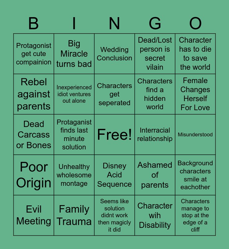 This bingo card has a free space and 50 words: LGBTQ, Characters manage to stop at the edge of a cliff, Dancing Scene for no reason, Seems like solution didnt work then magicly it did, Unhealthy wholesome montage, Disgusted by Kissing, Big Miracle turns bad, Vilain is actually not a vilain, Rebel against parents, Massive nerdy fanboy, Inexperienced idiot ventures out alone, Dead/Lost person is secret vilain, Background characters smile at eachother, Ashamed of parents, Important character secretly joins adventure, Hypocrital protagonist, Characters get seperated, Interracial relationship, Populair music with no lyrics, Character has to die to save the world, Protaganist finds last minute solution, Character wih Disability, Protagonist get cute compainion, Characters find a hidden world, Damsel In Distress, Dead Parents, Female Changes Herself For Love, Longing To Belong, Wedding Conclusion, Disney Acid Sequence, Friend to All Living Things, Disney Death, Disney Villian Death, Disney Dog Fight, Family Trauma, Lore Dump, Cute but Dangerous, Splitting Up Characters, Evil Guardian, Misunderstood, Kid Genius, Stupid Evil Sidekick, Clumsy Accident, Psycho Moment, Evil Meeting, Dead Carcass or Bones, Wholesome Moment, Dream Sequence, Poor Origin and Underdog.