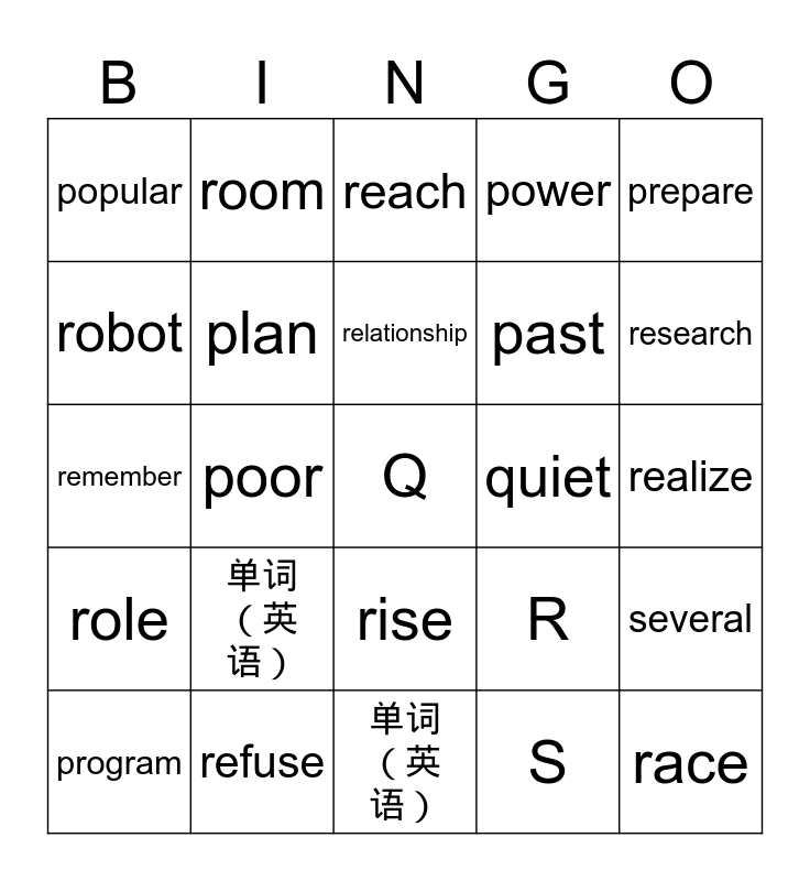 This bingo card has 56 words: plant, program, provide, popular, 单词(英语), push, plan, proper, past, present, power, picnic, prize, progress, prevent, pass, prepare, poor, pollute, Q, quiet, question, R, reach, reply, relationship, rapidly, raise, research, return, report, receive, relaxed, rule, realize, robot, remember, result, role, room, rise, race, reason, record, ready, 单词(英语), refuse, respect, regret, restaurant, S, stick, science, scientist, several and special.
