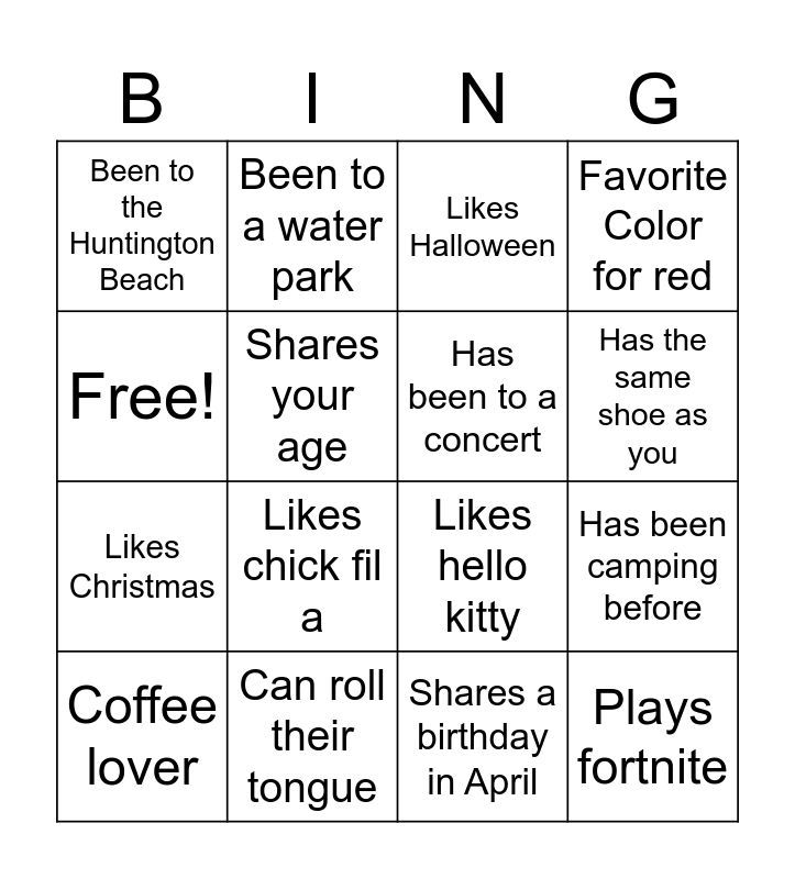 This bingo card has 16 words: Can roll their tongue, Has been camping before, Likes Halloween, Been to the Huntington Beach, Likes Christmas, Been to a water park, Likes hello kitty, Shares a birthday in April, Free!, Shares your age, Coffee lover, Favorite Color for red, Likes chick fil a, Has the same shoe as you, Has been to a concert and Plays fortnite.