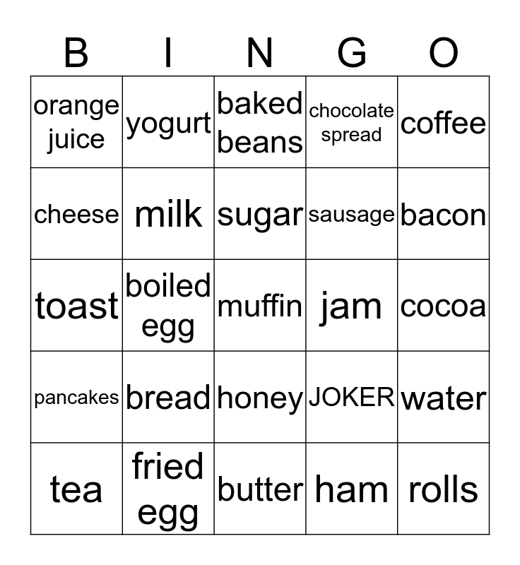 This bingo card has 25 words: bread, butter, sugar, tea, coffee, orange juice, cheese, yogurt, jam, honey, sausage, toast, JOKER, water, milk, rolls, cocoa, baked beans, bacon, boiled egg, muffin, fried egg, pancakes, chocolate spread and ham.