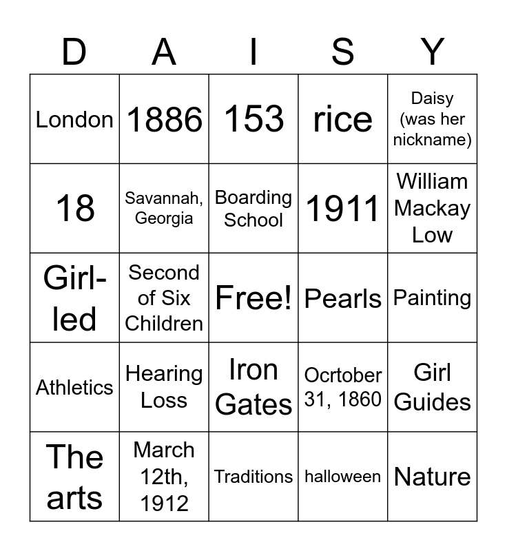 This bingo card has a free space and 24 words: Hearing Loss, March 12th, 1912, Boarding School, The arts, Daisy (was her nickname), London, 18, 1886, Pearls, Iron Gates, 1911, Girl-led, Ocrtober 31, 1860, Girl Guides, Savannah, Georgia, halloween, Painting, 153, William Mackay Low, Second of Six Children, Nature, Athletics, rice and Traditions.