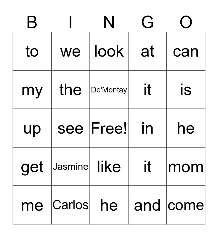 This bingo card has a free space and 24 words: Jasmine, Carlos, De'Montay, me, can, to, my, we, in, like, it, up, it, mom, the, and, he, look, is, see, come, get, at and he.