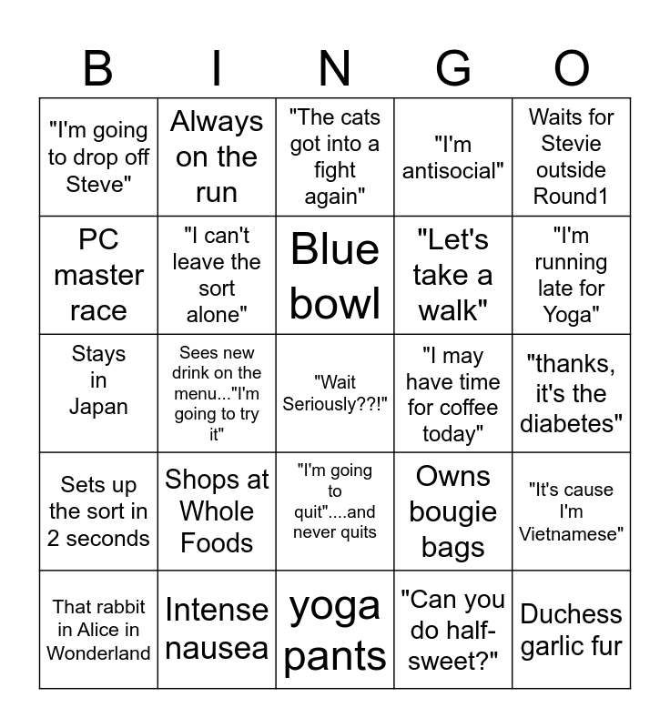 This bingo card has a free space and 24 words: Shops at Whole Foods, Intense nausea, Blue bowl, That rabbit in Alice in Wonderland, Waits for Stevie outside Round1, "I'm going to drop off Steve", PC master race, Always on the run, "I may have time for coffee today", "I'm going to quit"....and never quits, "Let's take a walk", Stays in Japan, Owns bougie bags, "It's cause I'm Vietnamese", "I can't leave the sort alone", "Can you do half-sweet?", "thanks, it's the diabetes", "The cats got into a fight again", "I'm running late for Yoga", Sees new drink on the menu..."I'm going to try it", Duchess garlic fur, Sets up the sort in 2 seconds, "I'm antisocial" and yoga pants.