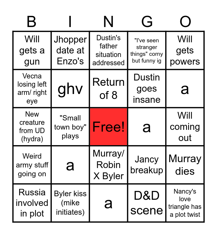 This bingo card has a free space and 26 words: Murray/ Robin X Byler, D&D scene, Return of 8, Byler kiss (mike initiates), Will gets powers, Will gets a gun, Vecna losing left arm/ right eye, Jhopper date at Enzo's, Will coming out, Jancy breakup, Dustin goes insane, New creature from UD (hydra), Murray dies, Russia involved in plot, "Small town boy" plays, The Vanishing of Holly Wheeler, "I've seen stranger things" corny but funny ig, Weird army stuff going on, Dustin's father situation addressed, Nancy's love triangle has a plot twist, a, a, a, a, ghv and jjk.