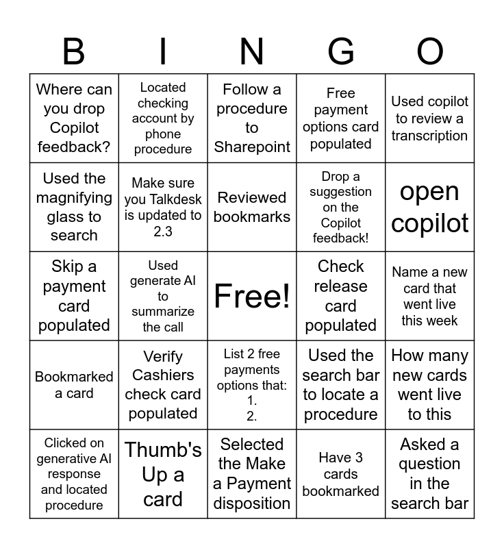 This bingo card has a free space and 24 words: Verify Cashiers check card populated, Thumb's Up a card, Reviewed bookmarks, Clicked on generative AI response and located procedure, Used copilot to review a transcription, Where can you drop Copilot feedback?, Used the magnifying glass to search, Located checking account by phone procedure, Check release card populated, List 2 free payments options that: 1. 2., Drop a suggestion on the Copilot feedback!, Skip a payment card populated, Used the search bar to locate a procedure, How many new cards went live to this, Make sure you Talkdesk is updated to 2.3, Have 3 cards bookmarked, Name a new card that went live this week, Follow a procedure to Sharepoint, open copilot, Used generate AI to summarize the call, Asked a question in the search bar, Bookmarked a card, Free payment options card populated and Selected the Make a Payment disposition.