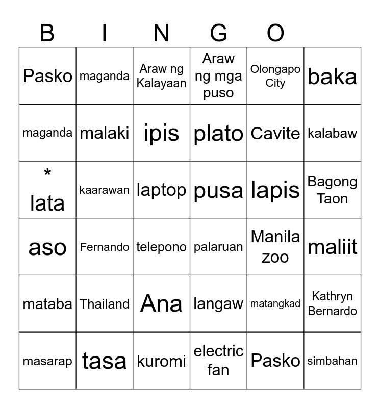 This bingo card has 36 words: langaw, Ana, electric fan, maganda, aso, pusa, malaki, kuromi, Olongapo City, matangkad, kalabaw, Araw ng mga puso, Kathryn Bernardo, kaarawan, plato, Pasko, mataba, lapis, * lata, Araw ng Kalayaan, laptop, Fernando, palaruan, telepono, Manila zoo, maganda, Cavite, tasa, ipis, baka, simbahan, masarap, maliit, Bagong Taon, Thailand and Pasko.