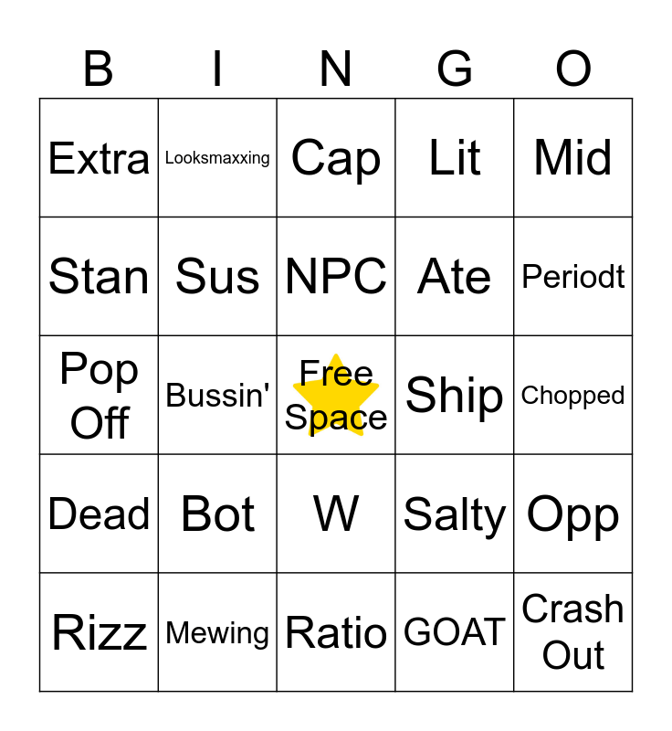 This bingo card has a free space and 39 words: Bet, No Cap, Slay, Sus, Rizz, W, NPC, Drip, Mid, Dead, Bussin', Lit, Crash Out, Chopped, Ship, Bot, Snack, Extra, Lowkey, Salty, Stan, Ratio, Ate, Periodt, It's Giving, Aura Farming, Selling, Highkey, Huzz, Looksmaxxing, Cooked, Sigma, Cap, Mewing, GOAT, Tweaking, Opp, Pop Off and Cooking.