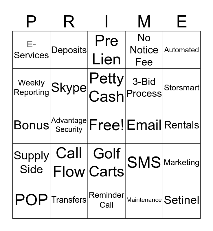 This bingo card has a free space and 82 words: Collections, Past Due, Pre Lien, Lien, Auction, Lock Cut, Simple Certified, Sparefoot, Prime Website, Prime Centric, Storage Treasures, HUD, Skype, Email, TLO, E-Services, POP, Weekly Reporting, EOM Reporting, Invoice, Packing Slip, 3-Bid Process, Setinel, Automated, Advantage Security, Chain of Command, Time Corrections, Lunch, OT, Mystery Shop, Call Flow, Audits, Bonus, Discounts, Refund, Reminder Call, Follow Ups, AR's, Storsmart, Locks, Phone Fee, No Notice Fee, Returned Payments, Autopay, Customer Info., Deposits, Check Request, Petty Cash, Cash Count, Merchandise, Vacates, Rentals, Transfers, Link/ Unlink, Change of Owner, Property Check, Lock Check, Walk Thru, Reminders, SMS, Email, WB Mason, Supply Side, Truck Rental, Reservation, Inquiry, E-Sign, MSDS, Blue Book, Concierge Manual, Daily Close, Proof Edit, Golf Carts, Maintenance, Schedules, Clip Board, Competition, Daily Checklist, Temp. Control, Letters, Marketing and Deliveries.
