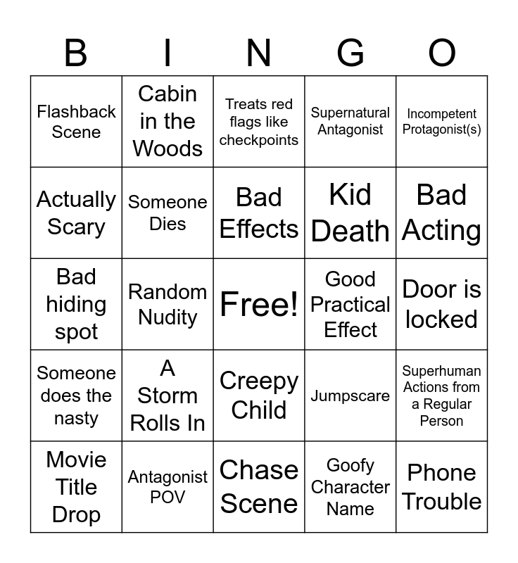 This bingo card has a free space and 49 words: Car Trouble, Phone Trouble, Dead Pet, Chase Scene, A Storm Rolls In, Useless Cops, Cabin in the Woods, Creepy Old Person, Actually Scary, Séance/Ouija Board Scene, Someone Dies, Supernatural Antagonist, Superhuman Actions from a Regular Person, Jumpscare, Jumpscare of something not scary, CGI Blood, Bad Effects, Good Practical Effect, Antagonist isn't actually dead, Incompetent Protagonist(s), Random Nudity, Goofy Character Name, Flashback Scene, Kid Death, Random Character with needed exposition, Bad Acting, Movie Title Drop, Flashlight Scene, Creepy Child, Someone does the nasty, "Ill be right back", "Uhhh... Guys?", Banshee Scream, Argument gets interrupted, Antagonist POV, Trip while being chased, Limb gets severed, Love Interest, Door is locked, Mysterious Phone Call, Drugs/Alcohol, Creepy Basement or Attic, "I know someone who can help", Inexplicable split up, Bad hiding spot, Treats red flags like checkpoints, Creepy Toy/Doll, "This better not be a prank" and Poltergeist behavior.