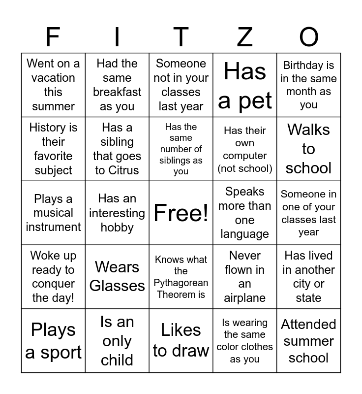 This bingo card has a free space and 24 words: Plays a sport, Wears Glasses, Has the same number of siblings as you, Is wearing the same color clothes as you, Birthday is in the same month as you, Went on a vacation this summer, Had the same breakfast as you, Someone not in your classes last year, Speaks more than one language, Someone in one of your classes last year, Plays a musical instrument, Has a sibling that goes to Citrus, Never flown in an airplane, Has lived in another city or state, History is their favorite subject, Is an only child, Likes to draw, Has a pet, Walks to school, Woke up ready to conquer the day!, Has an interesting hobby, Knows what the Pythagorean Theorem is, Has their own computer (not school) and Attended summer school.