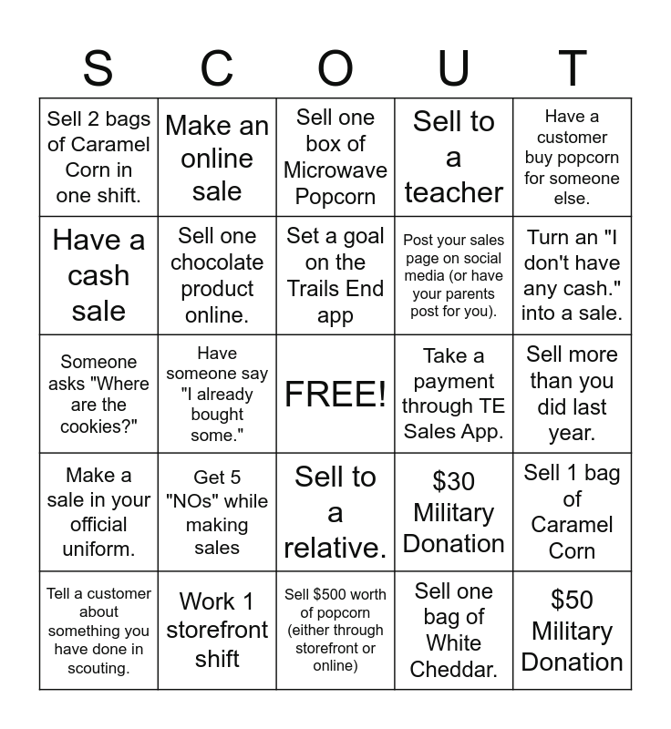 This bingo card has a free space and 24 words: Get 5 "NOs" while making sales, Work 1 storefront shift, Set a goal on the Trails End app, Tell a customer about something you have done in scouting., Have a customer buy popcorn for someone else., Sell 2 bags of Caramel Corn in one shift., Have a cash sale, Make an online sale, Take a payment through TE Sales App., Sell to a relative., Post your sales page on social media (or have your parents post for you)., Someone asks "Where are the cookies?", $30 Military Donation, Sell 1 bag of Caramel Corn, Sell one chocolate product online., Sell one bag of White Cheddar., Sell more than you did last year., Sell one box of Microwave Popcorn, Turn an "I don't have any cash." into a sale., Have someone say "I already bought some.", $50 Military Donation, Make a sale in your official uniform., Sell to a teacher and Sell $500 worth of popcorn (either through storefront or online).