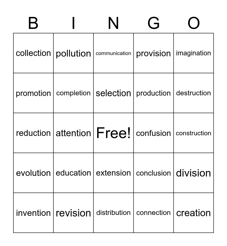 This bingo card has a free space and 31 words: distribution, action, attention, celebration, collection, communication, completion, conclusion, confusion, connection, construction, creation, decision, description, destruction, discussion, division, education, evolution, extension, imagination, information, invention, pollution, production, promotion, provision, reduction, revision, selection and vacation.