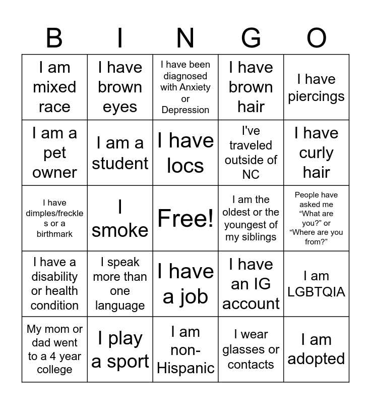 This bingo card has a free space and 24 words: I speak more than one language, I play a sport, I have locs, My mom or dad went to a 4 year college, I have piercings, I am mixed race, I am a pet owner, I have brown eyes, I am the oldest or the youngest of my siblings, I have a job, I've traveled outside of NC, I have dimples/freckle s or a birthmark, I have an IG account, I am LGBTQIA, I am a student, I wear glasses or contacts, People have asked me “What are you?” or “Where are you from?”, I have been diagnosed with Anxiety or Depression, I have curly hair, I smoke, I am adopted, I have a disability or health condition, I have brown hair and I am non-Hispanic.