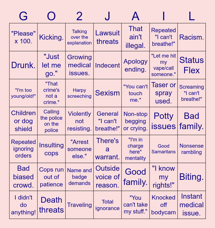 This bingo card has 49 words: "I know my rights!", "Let me hit my vape/call someone.", "You can't take my stuff.", Calling the police on the police, Harpy screeching, Bad family., Kicking., Traveling, Repeated "I can't breathe!", There's a warrant., Racism., Lawsuit threats, Taser or spray used., "You can't touch me.", Cops run out of patience, Potty issues, Drunk., Status Flex, Biting., That ain't illegal., Apology ending., Violently not resisting., "Please" x 100., "Just let me go.", I didn't do anything!, Growing medical issues., Screaming "I can't breathe!", Death threats, Sexism, "That crime's not a crime.", Instant medical issue., Non-stop begging or crying., Bad biased crowd., Name and badge demands, Children or dog shield, "I'm in charge here" mentality, Good Samaritans, Nonsense rambling, "I'm too young/old!", "Arrest someone else.", Outside voice of reason., Repeated ignoring orders, General "I can't breathe!", Total ignorance, Indecent, Talking over the explanation, Good family., Insulting cops and Knocked off bodycam.