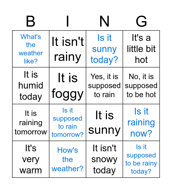 This bingo card has 16 words: How's the weather?, Is it raining now?, Is it sunny today?, What's the weather like?, It is raining tomorrow, It isn't rainy, It is sunny, It isn't snowy today, It is humid today, It is foggy, It's very warm, It's a little bit hot, Is it supposed to rain tomorrow?, No, it is supposed to be hot, Yes, it is supposed to rain and Is it supposed to be rainy today?.
