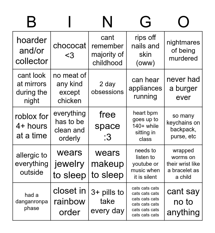 This bingo card has a free space and 24 words: wears jewelry to sleep, closet in rainbow order, 2 day obsessions, had a danganronpa phase, nightmares of being murdered, hoarder and/or collector, cant look at mirrors during the night, chococat <3, heart bpm goes up to 140+ while sitting in class, wears makeup to sleep, can hear appliances running, roblox for 4+ hours at a time, needs to listen to youtube or music when it is silent, wrapped worms on their wrist like a bracelet as a child, no meat of any kind except chicken, cats cats cats cats cats cats cats cats cats cats cats cats cats cats cats cats cats cats, so many keychains on backpack, purse, etc, cant remember majority of childhood, never had a burger ever, everything has to be clean and orderly, cant say no to anything, allergic to everything outside, rips off nails and skin (oww) and 3+ pills to take every day.
