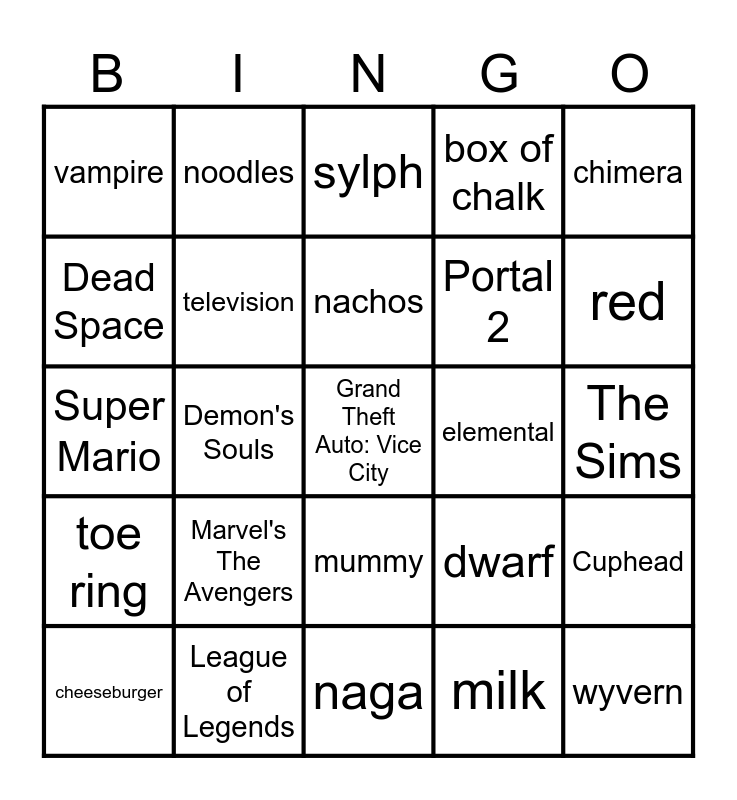 This bingo card has a free space and 24 words: cheeseburger, Marvel's The Avengers, nachos, milk, chimera, vampire, noodles, sylph, elemental, The Sims, Super Mario, television, dwarf, Cuphead, Dead Space, League of Legends, naga, box of chalk, red, toe ring, Demon's Souls, mummy, Portal 2 and wyvern.