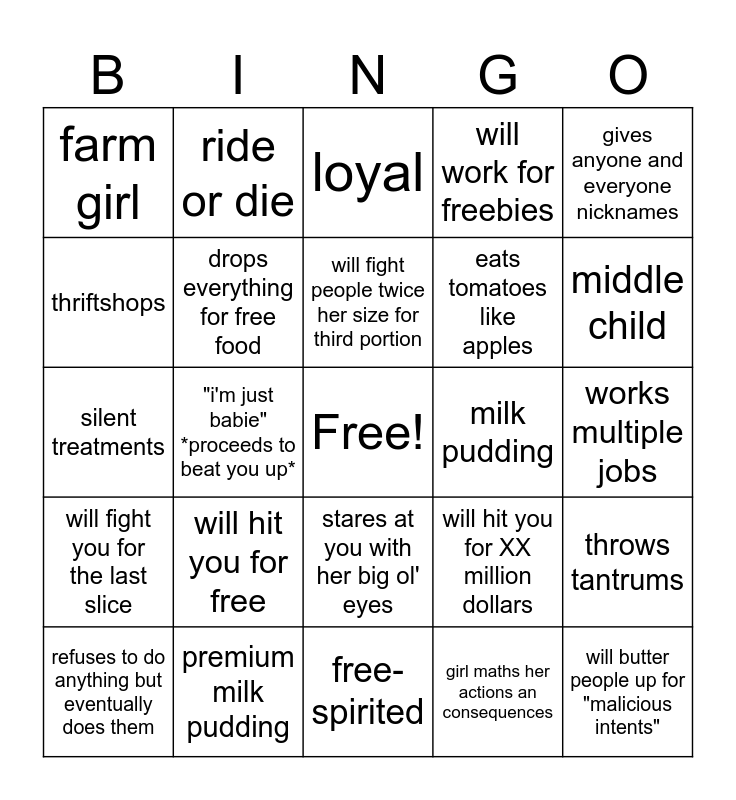 This bingo card has a free space and 24 words: refuses to do anything but eventually does them, will hit you for free, will fight people twice her size for third portion, girl maths her actions an consequences, gives anyone and everyone nicknames, farm girl, ride or die, loyal, milk pudding, works multiple jobs, silent treatments, drops everything for free food, will hit you for XX million dollars, throws tantrums, thriftshops, premium milk pudding, free-spirited, will work for freebies, middle child, will fight you for the last slice, "i'm just babie" *proceeds to beat you up*, stares at you with her big ol' eyes, eats tomatoes like apples and will butter people up for "malicious intents".