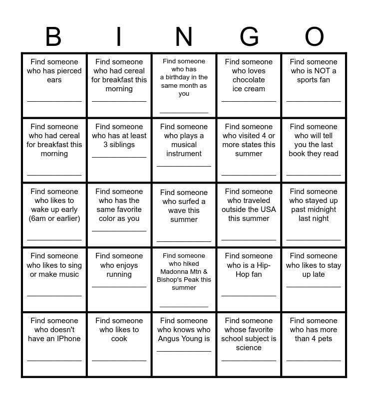 This bingo card has a free space and 29 words: Find someone who doesn't have an IPhone _____________, Find someone who is left handed _____________, Find someone who has the same favorite color as you _____________, Find someone who speaks more than 1 language _____________, Find someone who has pierced ears _____________, Find someone who has a birthday in the same month as you _____________, Find someone who has at least 3 siblings _____________, Find someone who enjoys running _____________, Find someone who traveled outside the USA this summer _____________, Find someone who likes to cook _____________, Find someone who stayed up past midnight last night _____________, Find someone who has more than 4 pets _____________, Find someone who knows who Angus Young is _____________, Find someone whose favorite school subject is science _____________, Find someone who will tell you the last book they read _____________, Find someone who went to the SLO Skatepark this summer _____________, Find someone who hiked Madonna Mtn & Bishop's Peak this summer _____________, Find someone who likes to sing or make music _____________, Find someone who is NOT a sports fan _____________, Find someone who likes to wake up early (6am or earlier) _____________, Find someone who is a Hip-Hop fan _____________, Find someone who is not from SLO County _____________, Find someone who visited 4 or more states this summer _____________, Find someone who had cereal for breakfast this morning _____________, Find someone who loves chocolate ice cream _____________, Find someone who had cereal for breakfast this morning _____________, Find someone who likes to stay up late _____________, Find someone who plays a musical instrument _____________ and Find someone who is a godparent _____________.